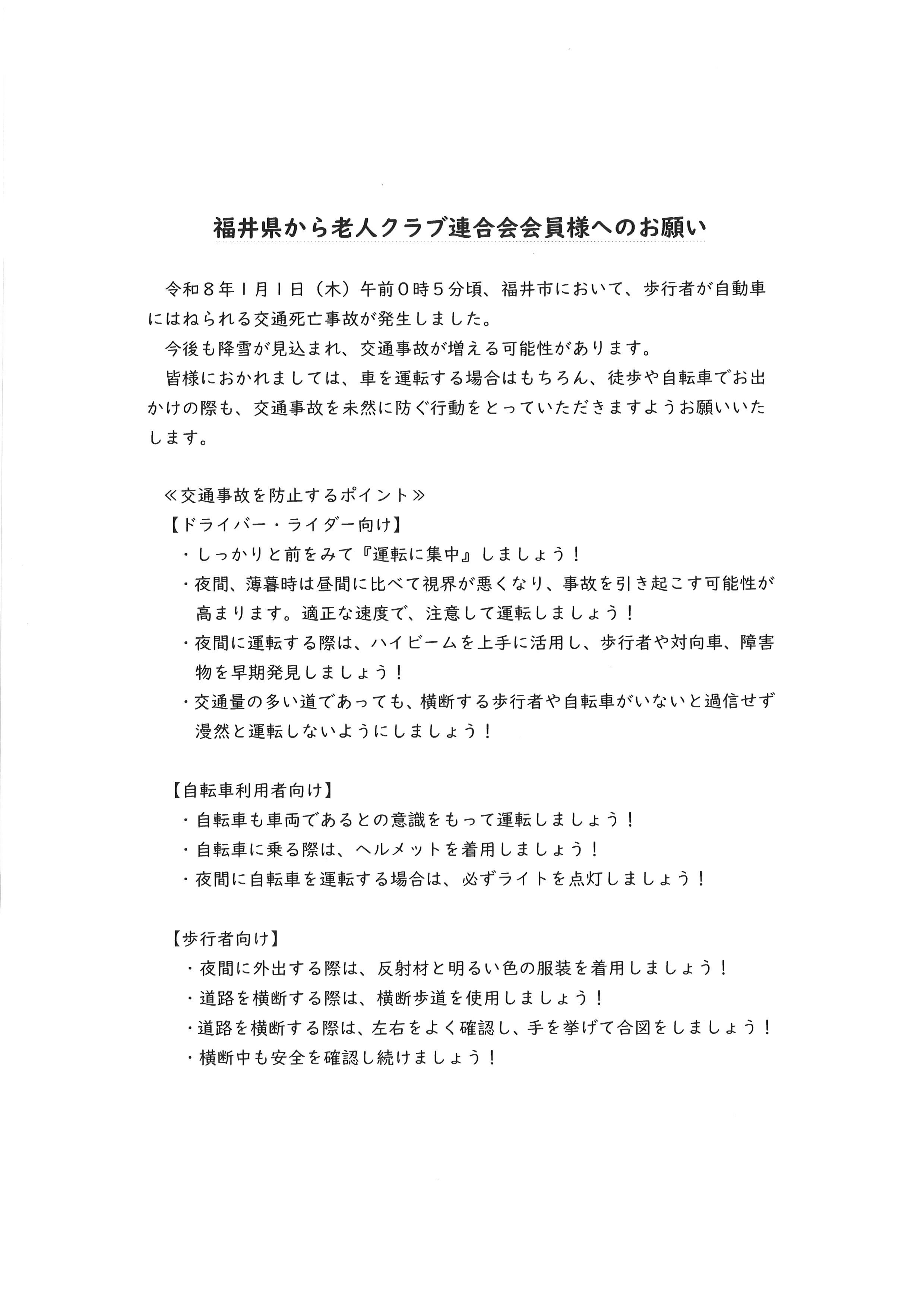 交通死亡事故が発生しました。 投稿日:2026年1月5日 年が明けた1月1日、福井市において軽自動車が歩行者をはねる交通死亡事故が発生し、70歳代の高齢者が犠牲となりました。 寒に入り本格的な降雪の時期を迎え、路面の凍結などの道路環境の悪化により、重大事故につながる可能性がより高まります。 このため福井県から、老人クラブ会員の皆さんに対しまして、交通事故を未然に防ぐ行動をとっていただくよう要請がありました。 会員の皆さんには、しっかり前を見て「運転に集中」し、特に「夜間・薄暮時は、速度を落として運転」するとともに、夜間外出時は「明るい色の服装と反射材を着用」するなど、交通事故の犠牲者にも加害者にもならない行動を徹底しましょう。